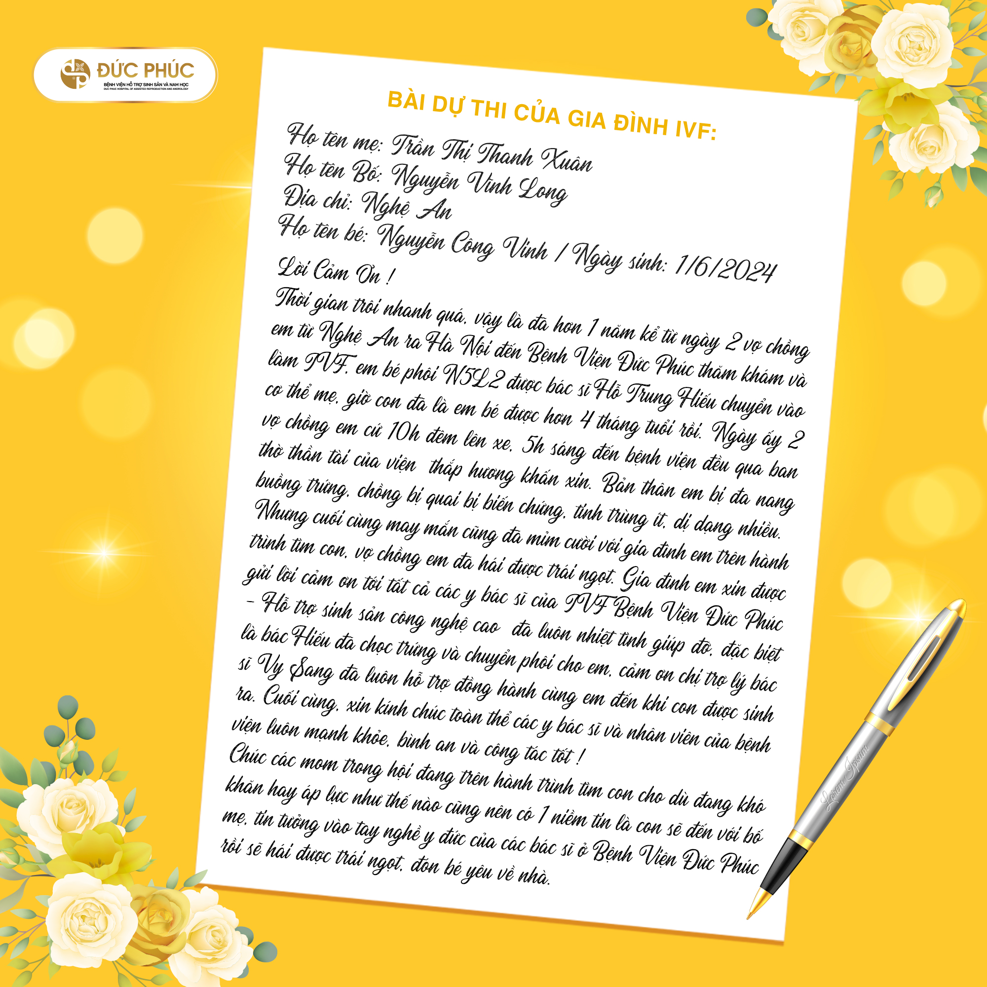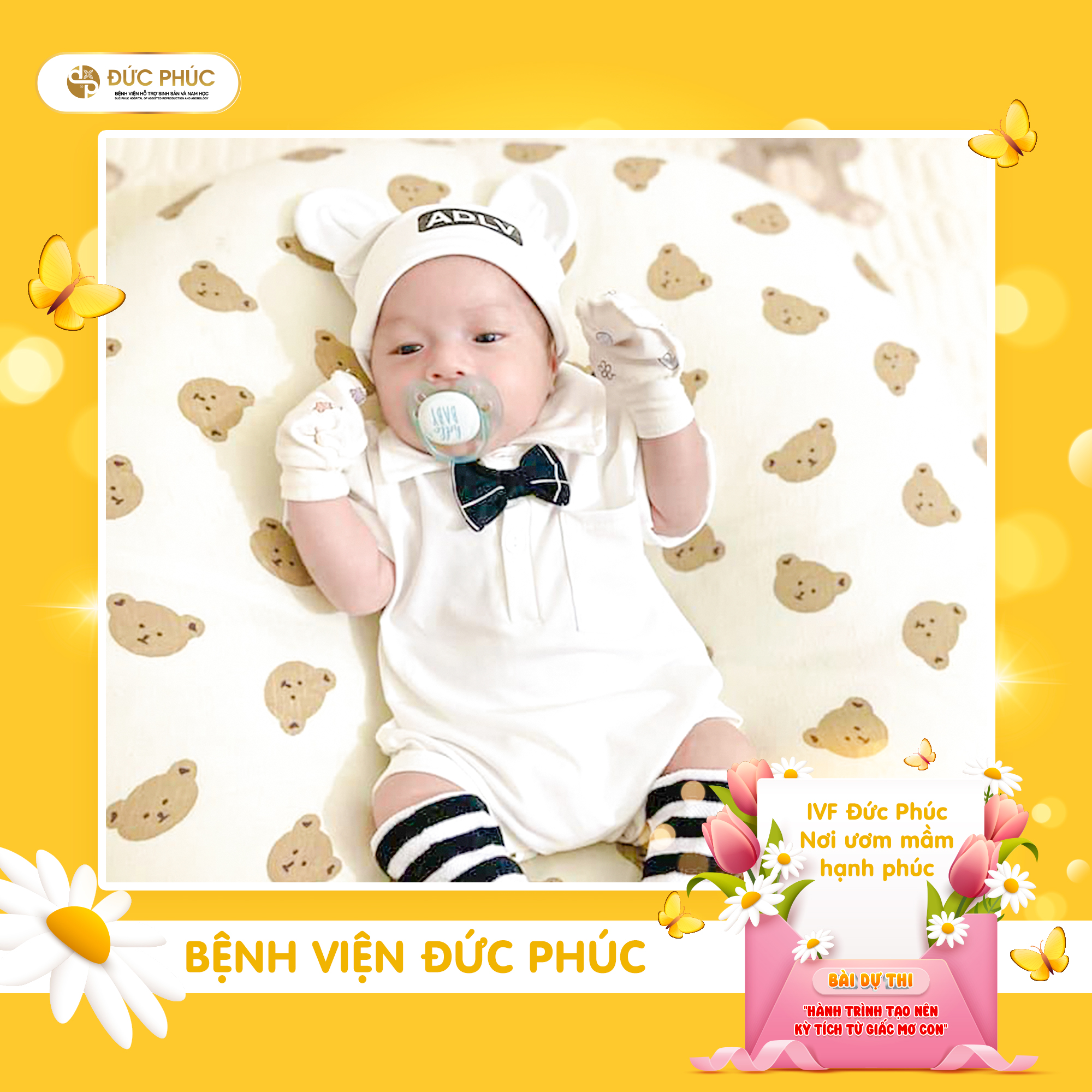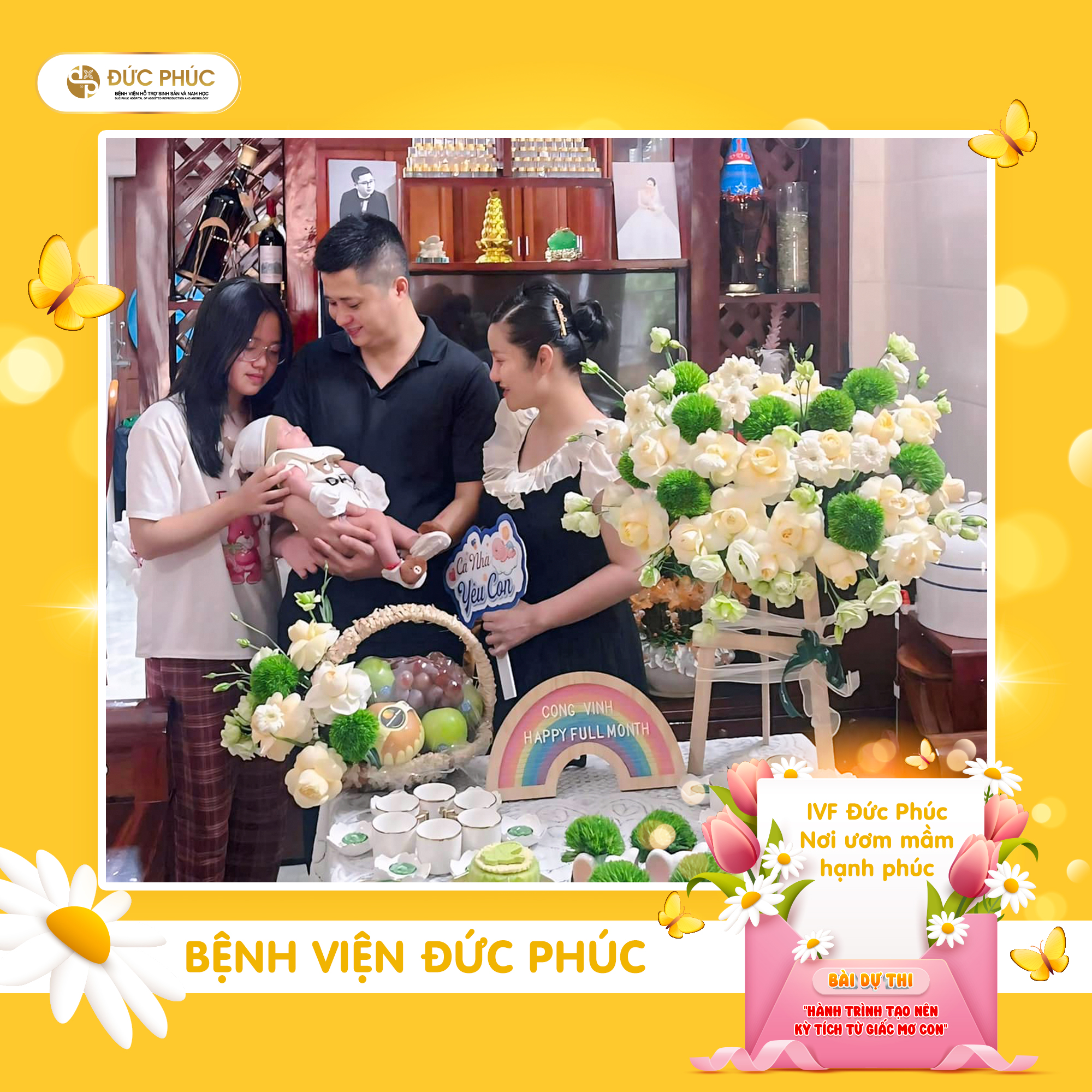 Nhưng cuối cùng may mắn cũng đã mỉm cười với gia đình em trên hành trình tìm con, vợ chồng em đã hái được trái ngọt. Gia đình em xin được gửi lời cảm ơn tới tất cả các y bác sĩ của IVF Bệnh Viện Đức Phúc – Hỗ trợ sinh sản công nghệ cao  đã luôn nhiệt tình giúp đỡ, đặc biệt là bác Hiếu đã chọc trứng và chuyển phôi cho em, cảm ơn chị trợ lý bác sĩ Vy Sang đã luôn hỗ trợ đồng hành cùng em đến khi con được sinh ra. Cuối cùng, xin kính chúc toàn thể các y bác sĩ và nhân viên của bệnh viện luôn mạnh khỏe, bình an và công tác tốt !