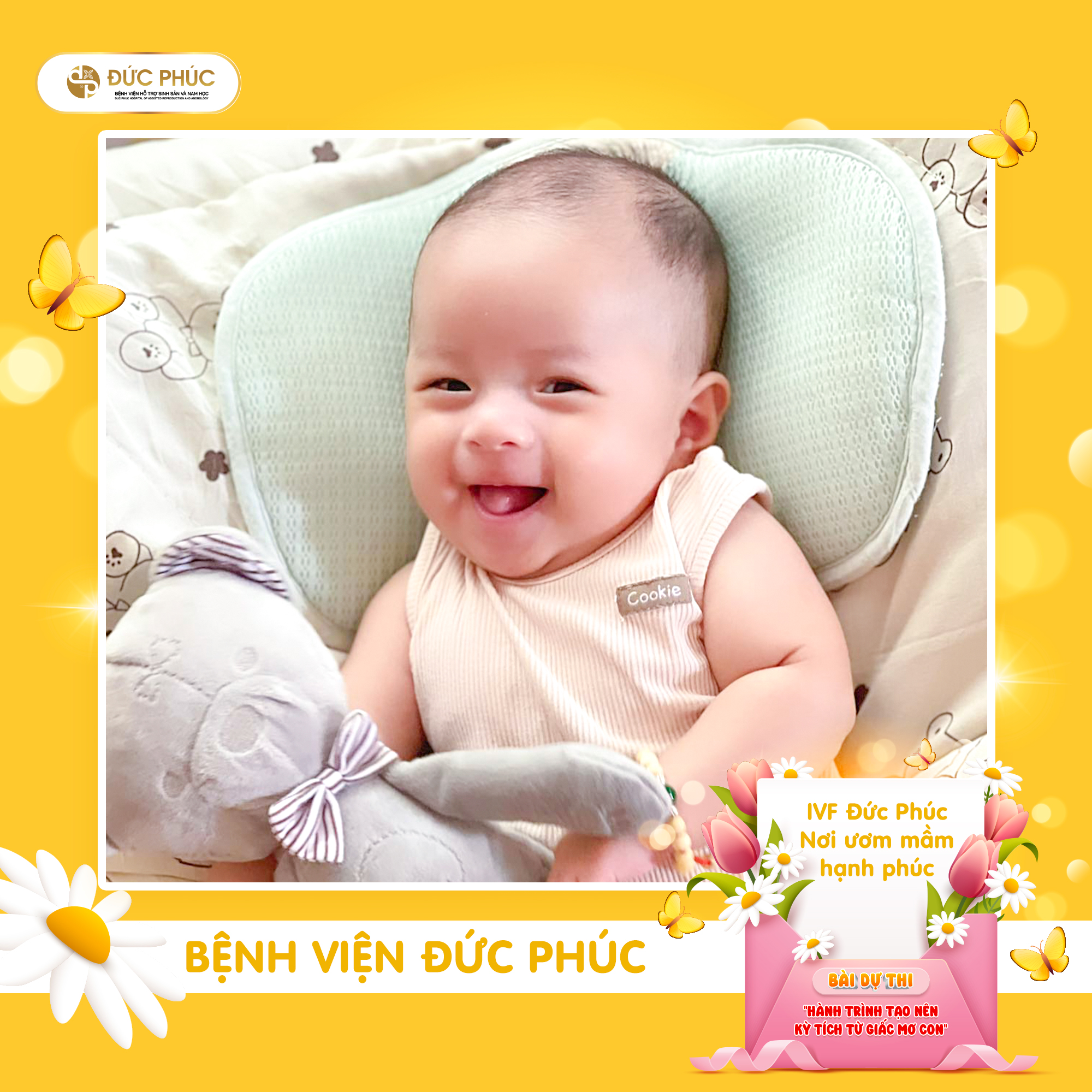 Thời gian trôi nhanh quá, vậy là đã hơn 1 năm kể từ ngày 2 vợ chồng em từ Nghệ An ra Hà Nội đến Bệnh Viện Đức Phúc thăm khám và làm IVF, em bé phôi N5L2 được bác sĩ Hỗ Trung Hiếu chuyển vào cơ thể mẹ, giờ con đã là em bé được hơn 4 tháng tuổi rồi. Ngày ấy 2 vợ chồng em cứ 10h đêm lên xe, 5h sáng đến bệnh viện đều qua ban thờ thần tài của viện  thắp hương khấn xin. Bản thân em bị đa nang buồng trứng, chồng bị quai bị biến chứng, tinh trùng ít, dị dạng nhiều.