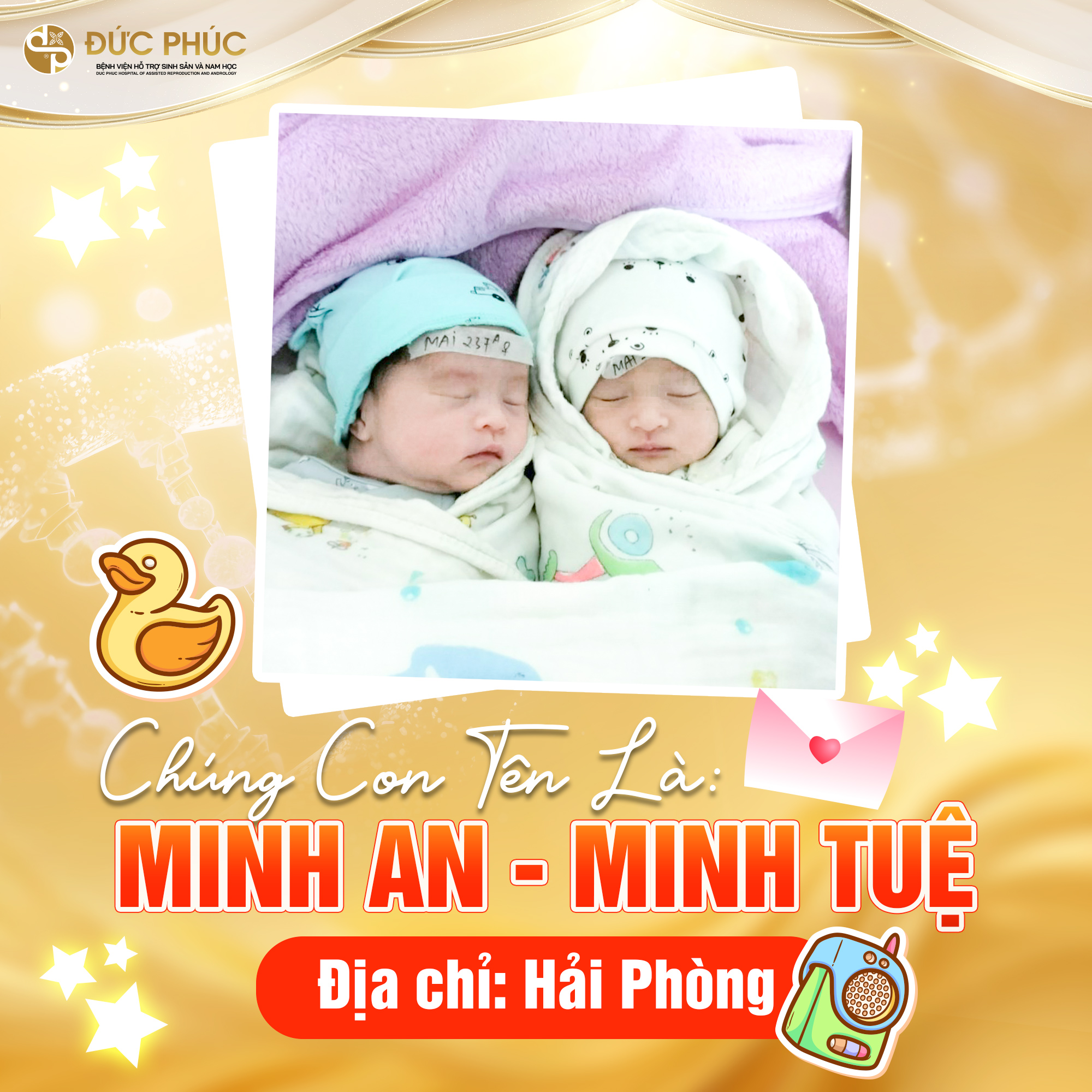 Cảm ơn gia đình chị Mai và anh Dương đã tin tưởng lựa chọn bệnh viện Đức Phúc cho hành trình thiêng liêng trong cuộc đời, chúc cho 2 thiên thần nhỏ đáng yêu của gia đình sẽ hay ăn chóng lớn, bình an!